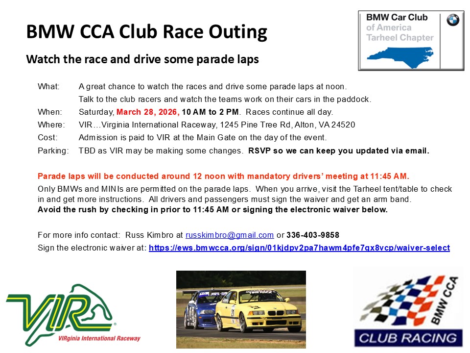 March 26-29 BMW CCA Club Race, Club Race School & Outing April 17-19 Tarheel Spring HPDE VIR Full May 14-17 Beach Bimmers! |